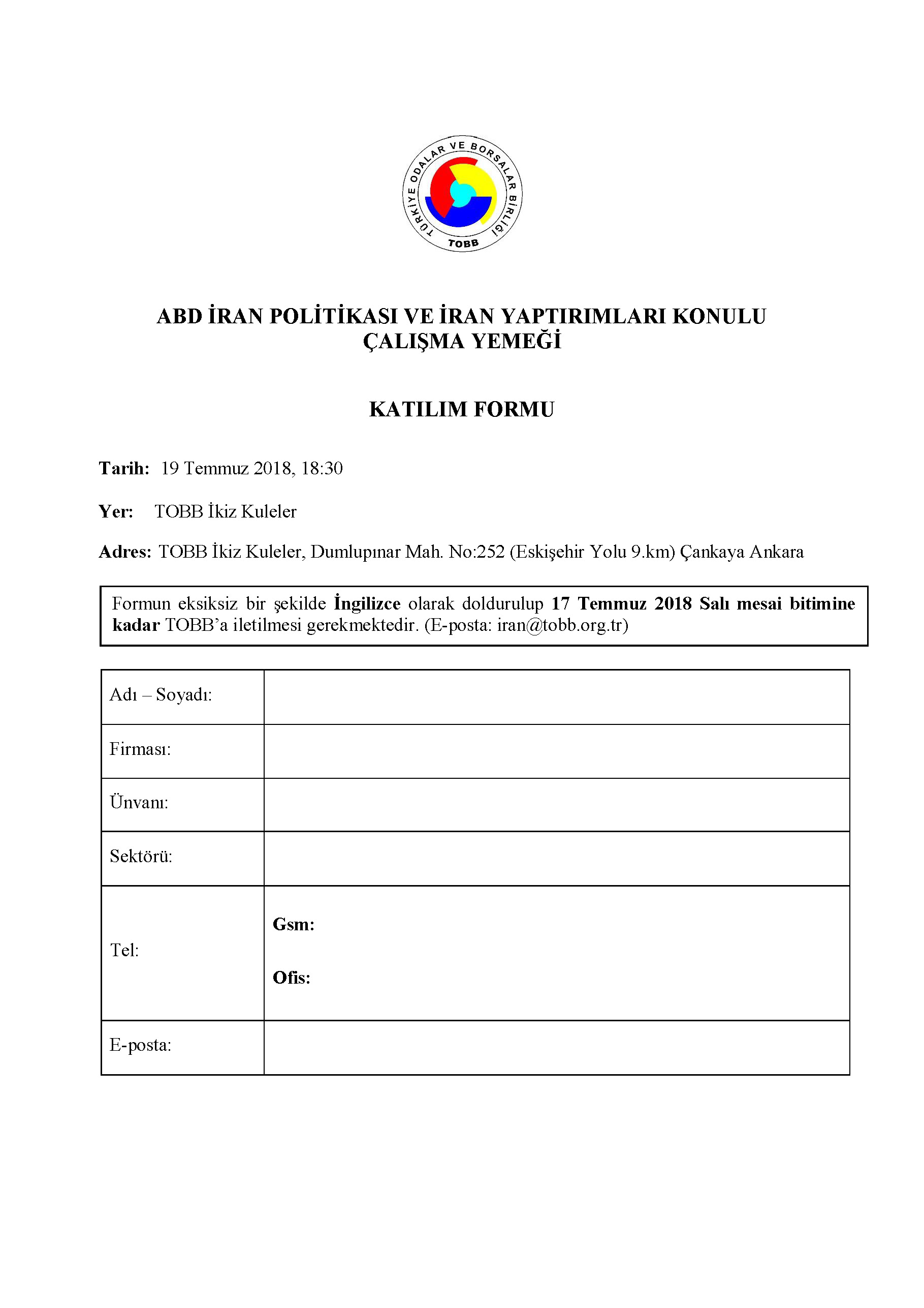 Çalışma yemeğine firmanızca iştirak edilmesi halinde ekte yer alan katılım formunun eksiksiz bir şekilde doldurularak, 17 Temmuz 2018 Salı günü mesai bitimine kadar Türkiye Odalar ve Borsalar Birliği (TOBB)’a e-posta yoluyla (iran@tobb.org.tr) iletilmesi gerekmektedir.