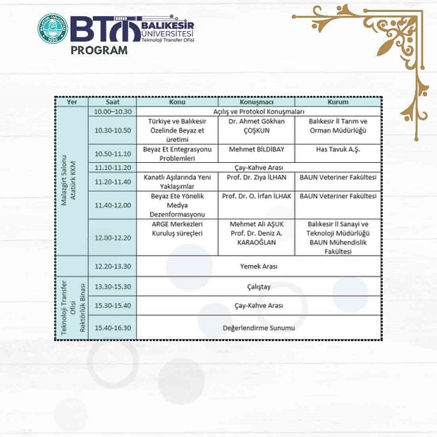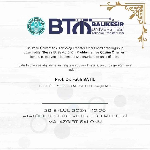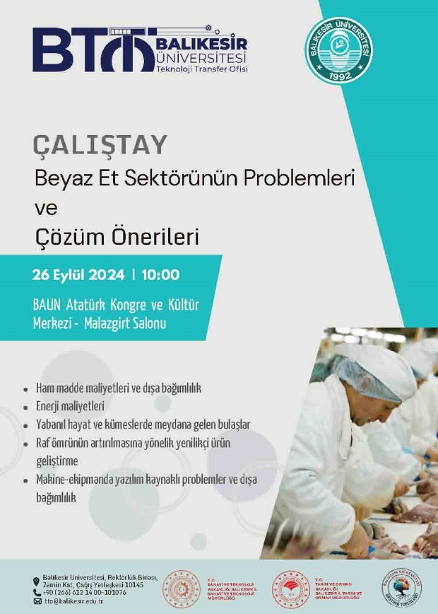Balıkesir Üniversitesi Teknoloji Transfer Ofisi Koordinatörlüğü ve Balıkesir Sanayi ve Teknoloji İl Müdürlüğü koordinasyonunda, 26 Eylül 2024 Perşembe günü saat 10:00’da Balıkesir Üniversitesi Atatürk Kongre ve Kültür Merkezi Malazgirt Salonunda “Beyaz Et Sektörünün Problemleri ve Çözüm Öneriler” konulu bir çalıştay gerçekleştirilecektir.