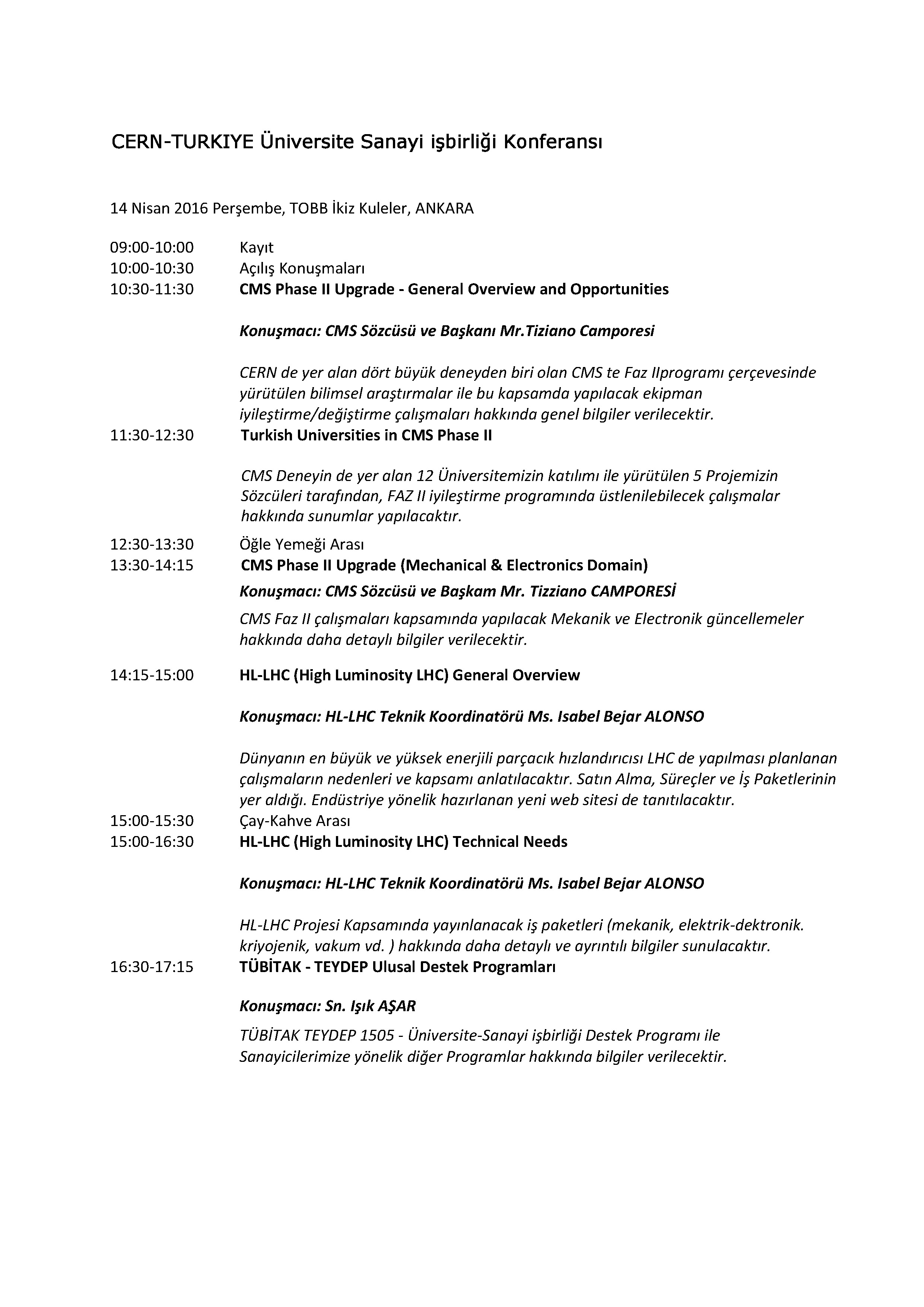Bu amaçla 14 Nisan 2016 Perşembe günü saat 9:00-18:00 saatleri arasında “CERN-Türkiye Üniversite ve Sanayi İşbirliği Konferansı” düzenlenecektir. Konferansın duyurusu aşağıda yer almakta olup konferansa katılım için kayıtlar www.tobb.org.tr/cernkayit sayfasında başlamıştır.