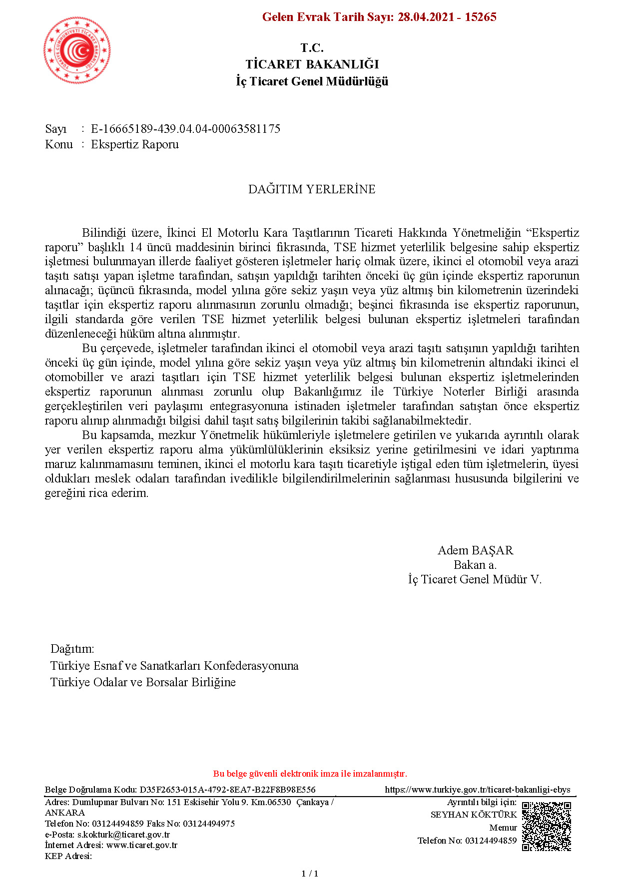 T.C. Ticaret Bakanlığı İç Ticaret Genel Müdürlüğü'nden Türkiye Odalar ve Borsalar Birliği (TOBB)'ne gelen 20.05.2021 tarih ve 4802 sayılı "Ekspertiz Raporu" konulu yazıda, Bakanlık ile Türkiye Notlerler Birliği arasında gerçekleştirilen veri paylaşımına istinaden ikinci el araç alım satım işlemlerinde, satış işleminden önce ekpertiz raporunun sistem üzerinden sorgulanacağı bildirilmektedir.