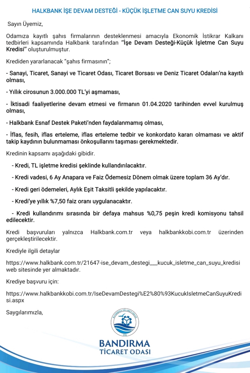 Krediye başvuru için: https://www.halkbankkobi.com.tr/IseDevamDestegi%E2%80%93KucukIsletmeCanSuyuKredisi.aspx