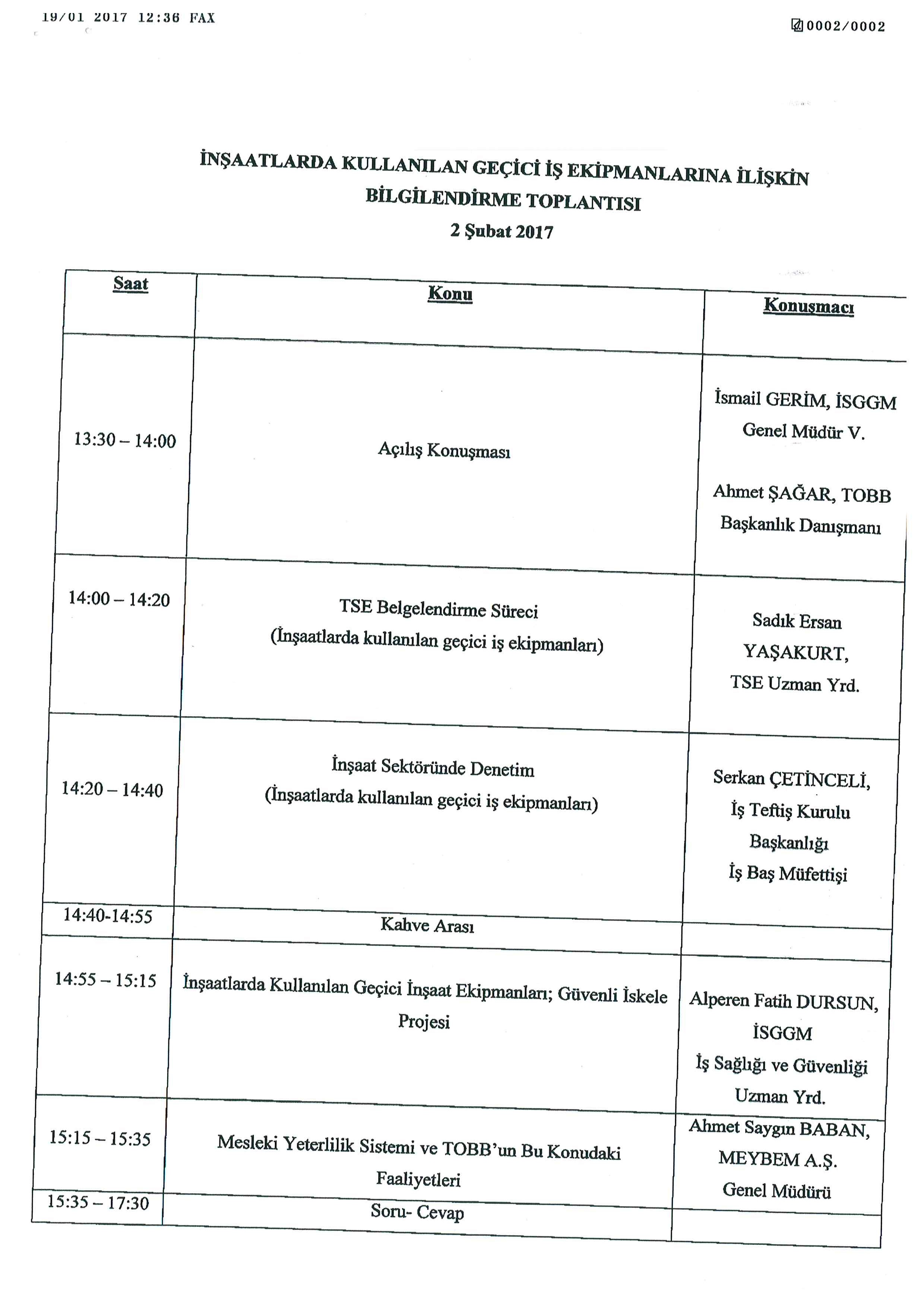 İnşaat sektöründe yaşanan iş kazalarının önlenmesi amacıyla İş Sağlığı ve Güvenliği Genel Müdürlüğü ve Türkiye Odalar ve Borsalar Birliği (TOBB) işbirliği ile inşaat müteahhitleri ve geçici iş ekipmanları üreticilerine yönelik olarak 02 Şubat 2017 tarihinde Ankara TOBB Sosyal Tesislerinde saat 13:30 da bir bilgilendirme toplantısı düzenlenecektir.