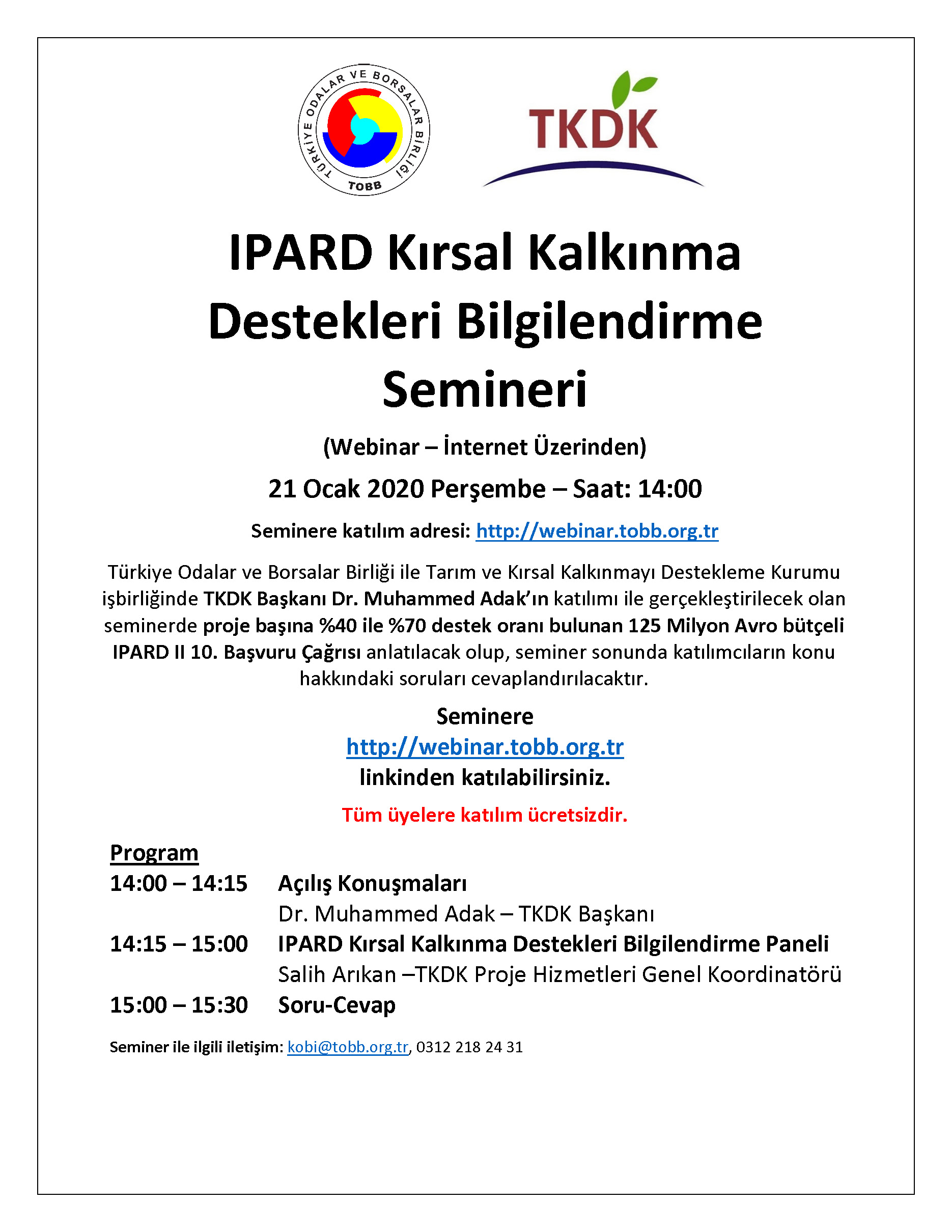21 Ocak 2021 Perşembe – Saat: 14:00' da Türkiye Odalar ve Borsalar Birliği ile Tarım ve Kırsal Kalkınmayı Destekleme Kurumu işbirliğinde TKDK Başkanı Dr. Muhammed Adak’ın katılımı ile gerçekleştirilecek olan seminerde proje başına %40 ile %70 destek oranı bulunan 125 Milyon Avro bütçeli IPARD II 10. Başvuru Çağrısı anlatılacak olup, seminer sonunda katılımcıların konu hakkındaki soruları cevaplandırılacaktır.