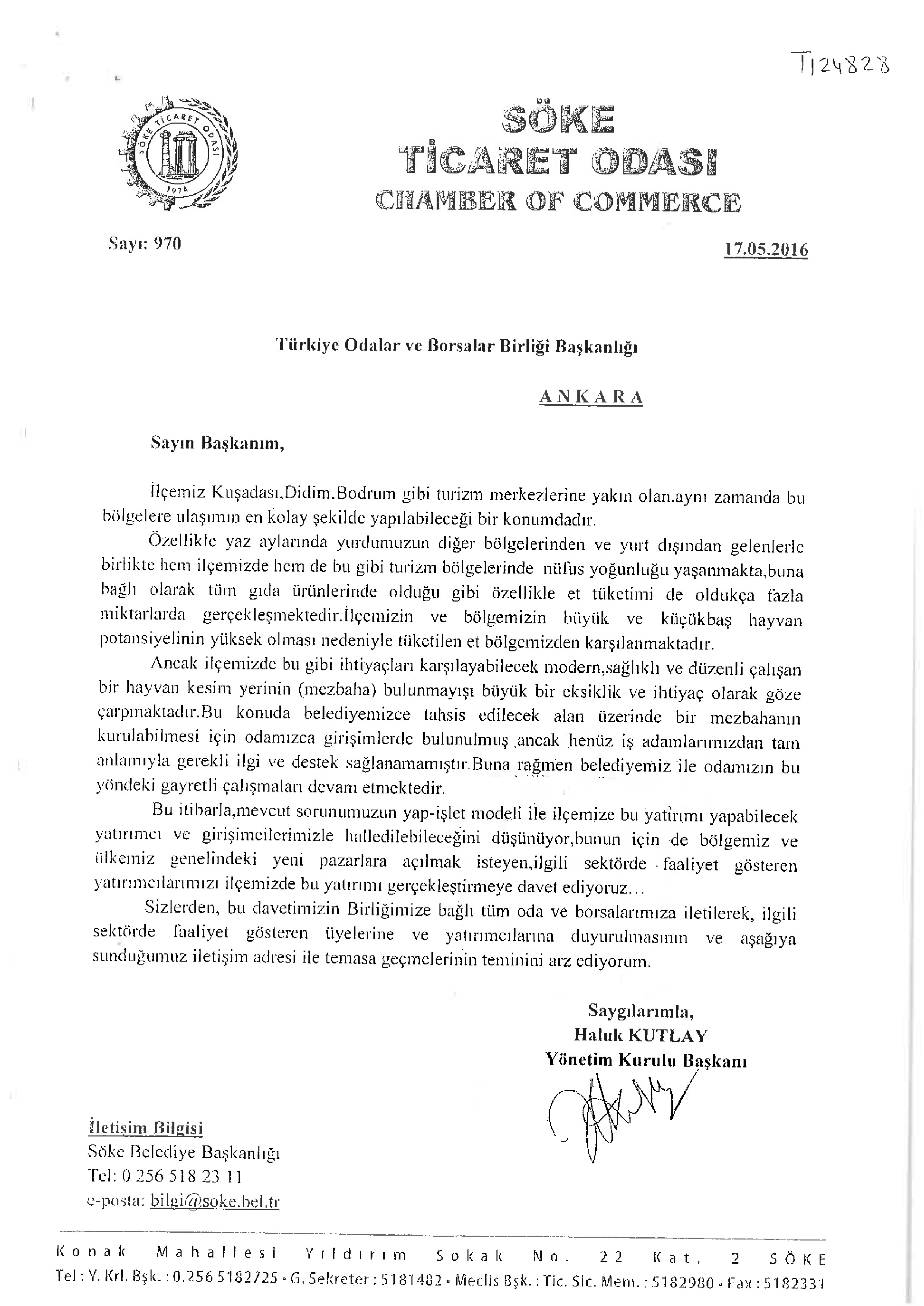 Söke Ticaret Odası’ndan TOBB’ne intikal eden 17.05.2016 tarihli ve 970 sayılı yazıda; yaz aylarında ilçede nüfus yoğunluğu yaşandığı, et tüketiminin oldukça fazla olduğu, ilçede büyük ve küçükbaş hayvan potansiyelinin de yüksek olduğu, ilçede modern, sağlıklı ve düzenli çalışan hayvan kesim yeri bulunmadığı, bu konuda belediye tarafından tahsis edilecek alan üzerine bir mezbahanın kurulabilmesi için çalışmalar yapıldığını söz konusu mezbaha yapımının yap-işlet modeli kapsamında ilçede yatırım yapabilecek yatırımcı ve girişimcilere ihtiyaç olduğu belirtilmiştir.