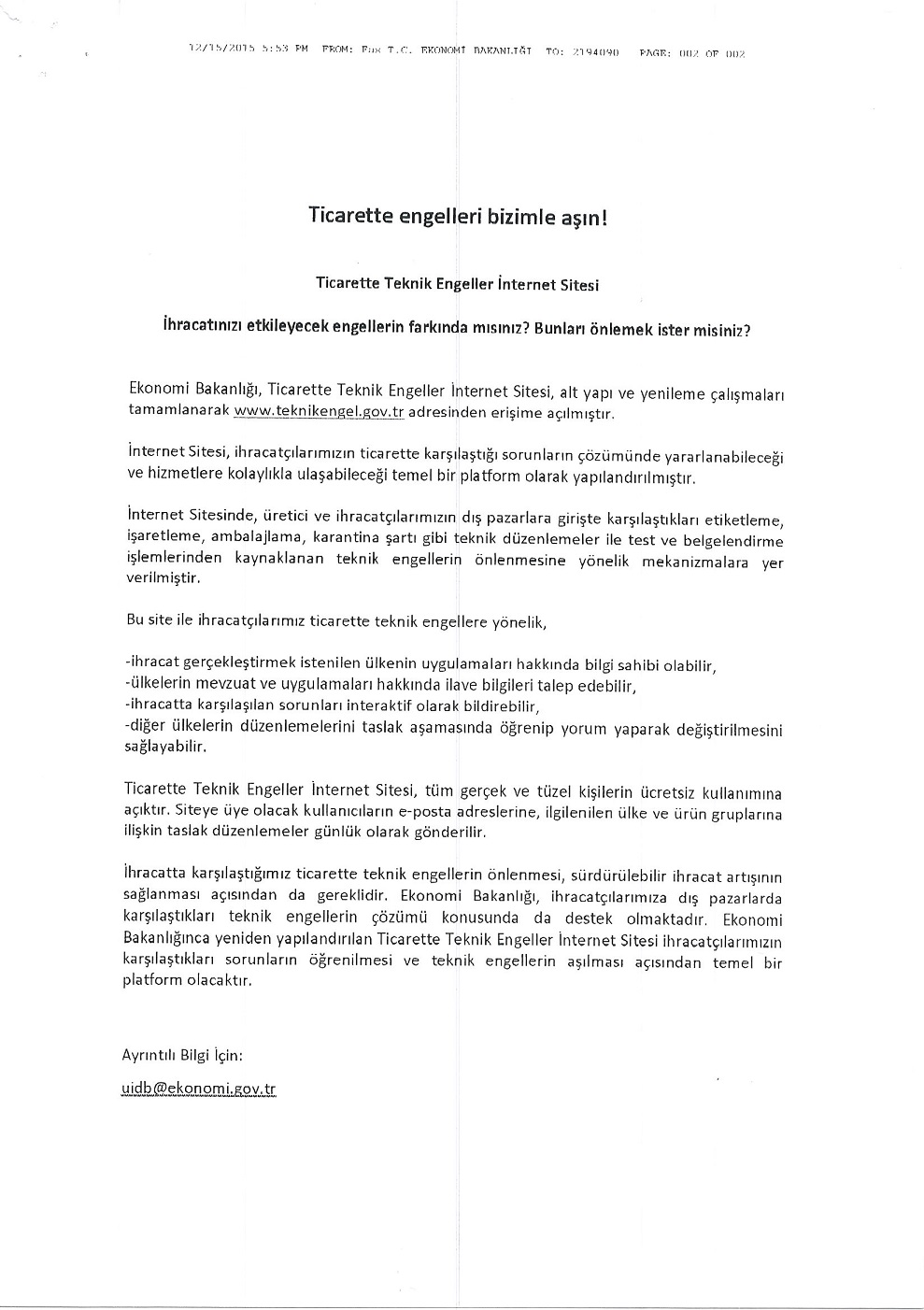 Ekonomi Bakanlığınca hazırlanan " Ticarette Teknik Engeller İnternet Sitesi" yeniden yapılandırılarak, yeni ara yüzüyle www.teknikengel.gov.tr adresinden erişime açılmıştır.