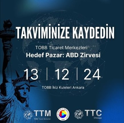 TOBB Ticaret Merkezi çalışmaları, yararlanma süreç ve koşulları hakkında bilgilendirme yapmak, Merkezin hizmetlerinden yararlanan firmaların deneyimlerini öğrenmek üzere, 13 Aralık 2024 Cuma günü, 10.00–17.30 saatleri arasında “TOBB Ticaret Merkezleri Hedef Pazar ABD Zirvesi” adıyla bir toplantı düzenleneceği, Birlik Başkanımız Sayın M. Rifat Hisarcıklıoğlu’nun ev sahipliğinde gerçekleştirilecek etkinliğe, Ticaret Bakanı Sayın Prof.Dr. Ömer Bolat, Ticaret Bakan Yardımcısı Sayın Volkan Ağar, ABD Büyükelçiliği Maslahatgüzarı ile kamu ve özel sektörden uzmanların konuşmacı olarak katılacakları, Etkinlik esnasında ayrıca, katılımcıların (TOBB TC) çözüm ortaklarıyla birebir görüşme yapma imkânını bulacakları, etkinliğin ayrıntılı programının katılım teyidi veren firmalara ayrıca gönderileceği bildirilmiş olup, “TOBB Ticaret Merkezleri Hedef Pazar ABD Zirvesi” etkinliğine katılmak isteyen üyelerinizin 6 Aralık 2024 Cuma gününe kadar https://anket.tobb.org.tr/#/anket/TTM-ABD-Zirvesi adresinde yer alan formun doldurulmasının gerektiği bildirilmiştir.