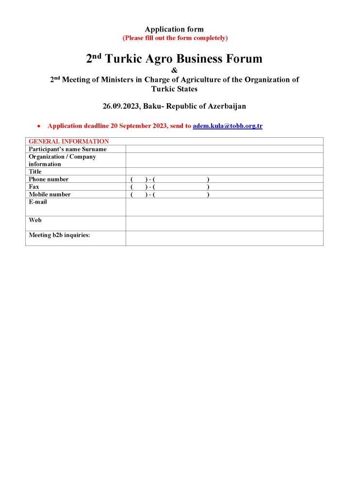 Katılmayı düşünen üyelerinizin katılım teyitlerini en geç ekteki formu eksiksiz doldurarak 20 Eylül 2023 tarihine kadar Türk Ticaret ve Sanayi Odaları Birliği'ne (Adem Kula Tel: 0212 324 9542 - E-posta: adem.kula@tobb.org.tr ) bildirmeleri gerekmektedir.