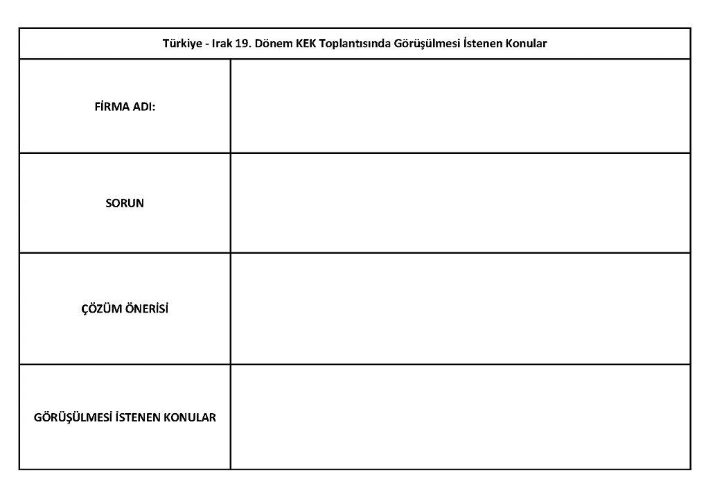 Türkiye Odalar ve Borsalar Birliği’nden aldığımız 23.07.2019 tarih ve 7729 sayılı yazıda; Ticaret Bakanlığı’nın 22.07.2019 tarihli ve 86633424-724.01.01 sayılı yazısında; Türkiye- Irak 19. Dönem Karma Ekonomik Komisyonu (KEK) Toplantısı'nın, Enerji ve Tabii Kaynaklar Bakanımız Sayın Fatih Dönmez ile Irak Dışişleri Bakanı Sayın Mohammed A. Alhakim'in eş başkanlıklarında Eylül ayında Bağdat'ta gerçekleştirilmesinin öngörüldüğünün bildirildiği belirtilmektedir.