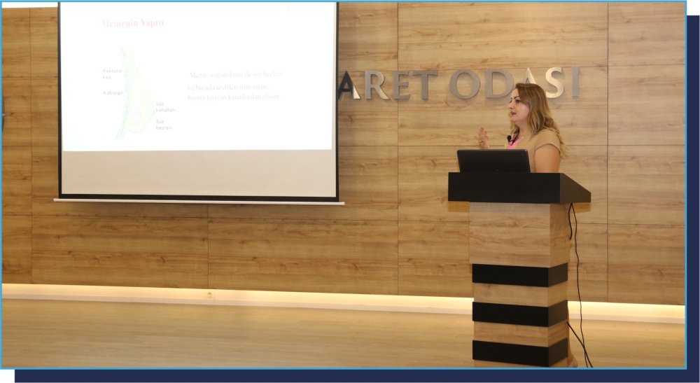 Seminerde ilk sunumu yapan Genel Cerrahi Uzmanı Op. Dr. Tuğçe Karaçay, Kendi Kendine Meme Muayenesi’nin (KKMM) meme kanserinin erken tanısında en etkili yöntem olduğunu vurguladı. Karaçay, “KKMM’yi 20 yaşından sonra her kadın mutlaka öğrenmelidir. En iyi dönem adetin ilk günü itibariyle 7-10 gün sonra herhangi bir günde yapılmasıdır, adet görmüyor ise her ayın belli bir gününde KKMM yapmak önemli. 20 yaş üzeri 2 yılda bir, 40 yaş üzeri kadınlar ise yılda bir mutlaka doktor muayenesi yaptırmalıdır.” diye konuştu.