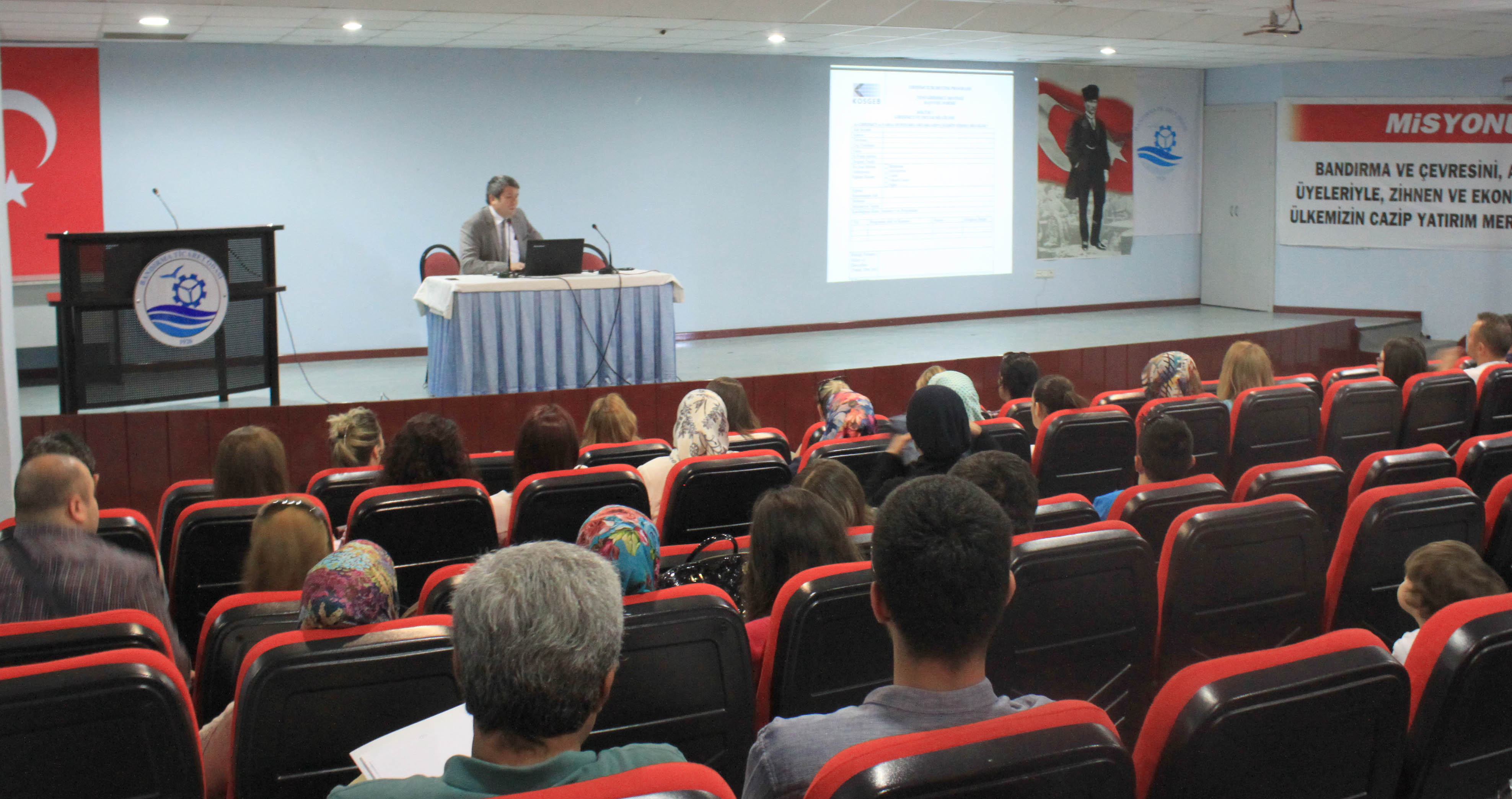 Sertifika töreni öncesinde KOSGEB Balıkesir İl Müdürü Hüsamettin ÇAY tarafından katılımcılara iş planı hazırlama ve proje yazma teknikleri hakkında bilgi verildi. Soru cevap şeklinde geçen konferansın ardından KOSGEB Balıkesir İl Müdürü Hüsamettin ÇAY, Bandırma Ticaret Odası Kadın Girişimciler Kurulu Başkanı Gizem Ozar Uz ve Kadın Girişimciler Kurulu üyeleri kursiyerlere sertifikalarını takdim etti.
