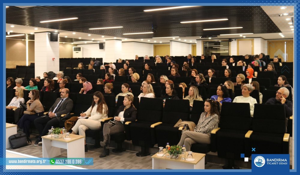 Yoğun katılımın olduğu büyük ölçüde ilgi gören eğitim katılımcıların sorularıyla sona ererken, Bandırma Ticaret Odası Kadın Girişimciler Kurulu Başkanı Gözde Engür ve Erdek Ticaret Odası Kadın Girişimciler Kurulu Başkanı Çisem Tanrıöver Özhuy günün anısına eğitmen Av. Esra Karabuğa’ya hediye takdiminde bulundu.