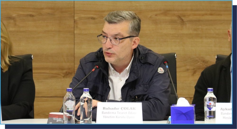 Bandırma Ticaret Odası Yönetim Kurulu Üyesi Bahadır Çolak yaptığı konuşmasında; kendi sektörü ve şirketini tanıtırken, çalışanlara sağlanan imkanlar ve yaşanılan teknik eleman azlığı sorunu ile ilgili bilgi verdi. Teknik eleman eksikliğinin yoğun bir şekilde yaşandığını söyleyen Bahadır Çolak, bazı işler için şehir dışından usta getirmek zorunda kaldıklarını belirtirken, meslek liselerinden mezun olanların şirketlerde istihdam edilme ve kendi işyerini açma seçenekleri olduğu için; işsiz kalma oranının çok düşük olduğunu, ayrıca devletin işyeri açacak kişilere de destekleri olduğunu belirtti.